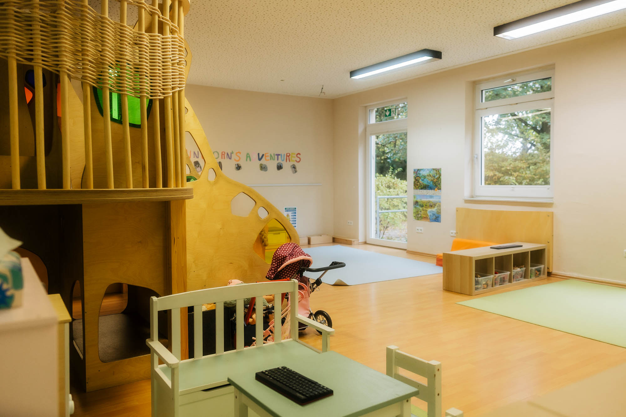 Auf einer Fläche von rund 550 Quadratmetern bietet unsere Kita helle Gruppenräume, einen Mehrzweckraum, ein Kinderbistro und spezielle Funktionsräume für Musik und Bewegung. So haben Kinder immer die Möglichkeit, sich auszuprobieren – im Spiel, beim Lernen und im Miteinander.